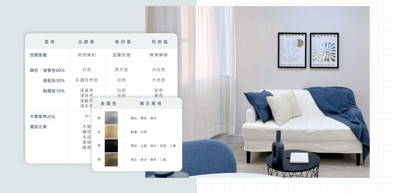 聰明的軟裝師會事先做好幾個「標準模組方案」,包含常用的色彩搭配模組、家具選擇模組、軟裝飾品模組。