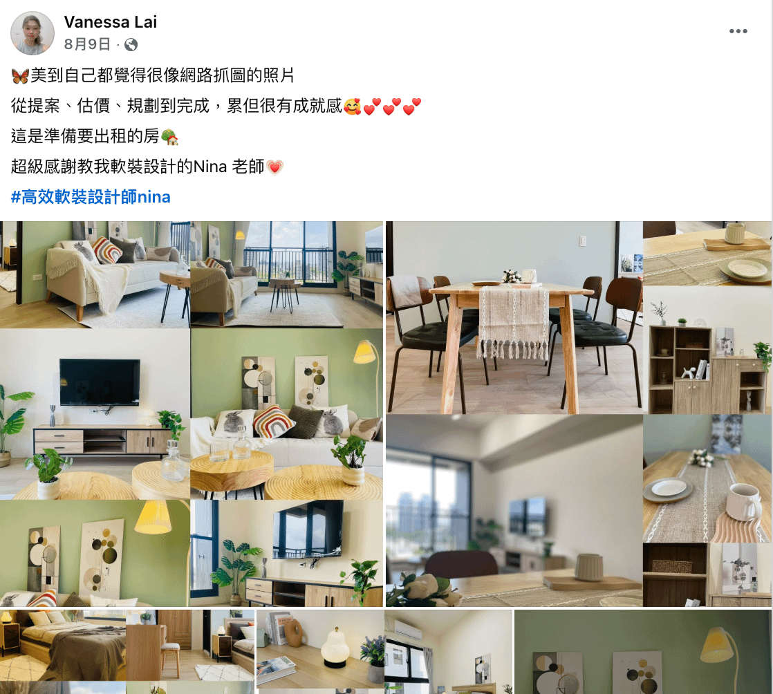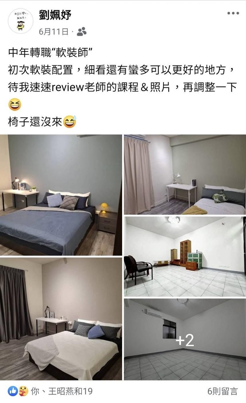 上完 Nina 課程後,成功完成了人生第一個軟裝案子,透過色彩分區、床頭軟件搭配、布織品層次與燈光配置,讓房間從冰冷變得溫暖、有質感。